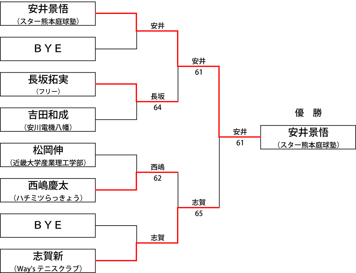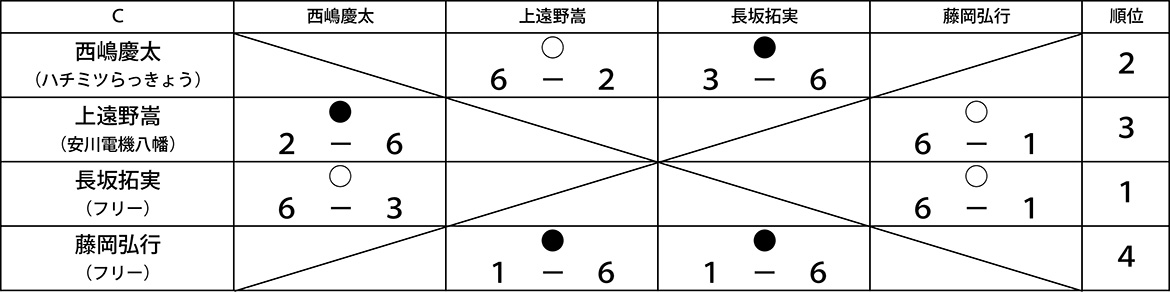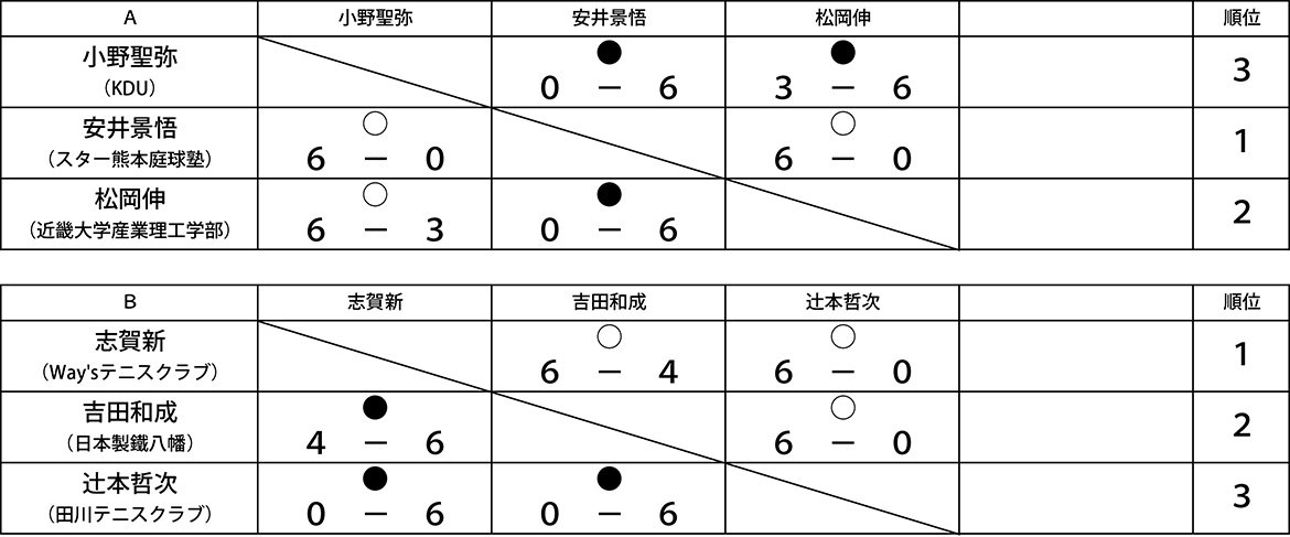 21 第10回ナイターシングルス(BC)大会結果 ナイターシングルスBC (2018/7/21) 1 ・2位リーグ 優勝 宇都宮慎吾(フリー):写真左 準優勝 鞘野雅之(行橋テニスクラブ):写真右 3位 田辺佳矩(YCC) ================ 3位リーグ […] 公開済み: 2018年7月21日更新: 2019年7月5日作成者: 田川庭球倶楽部カテゴリー: 大会結果
