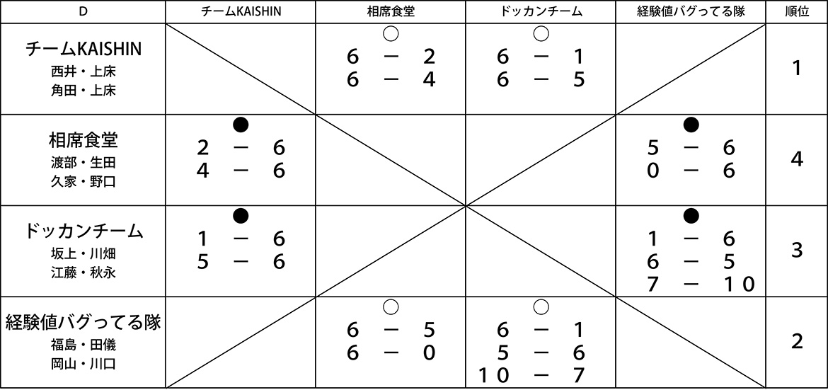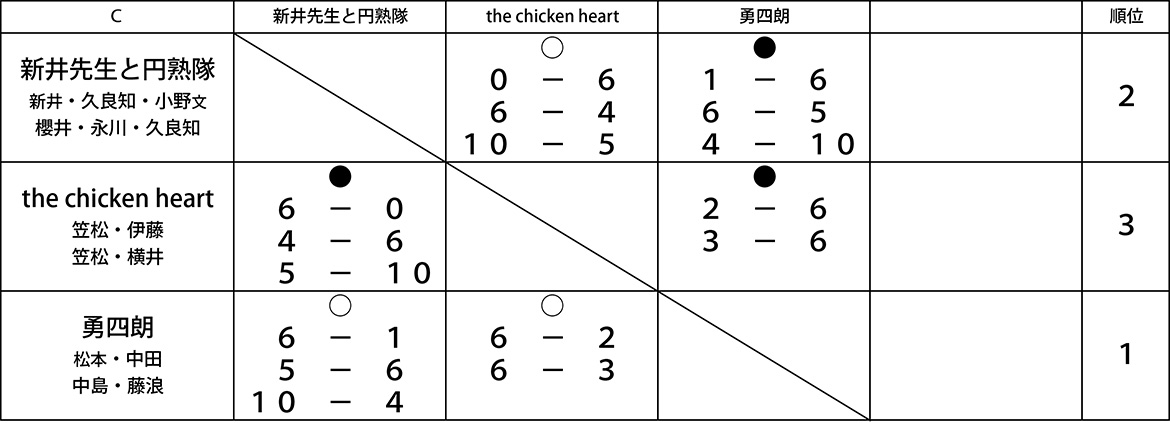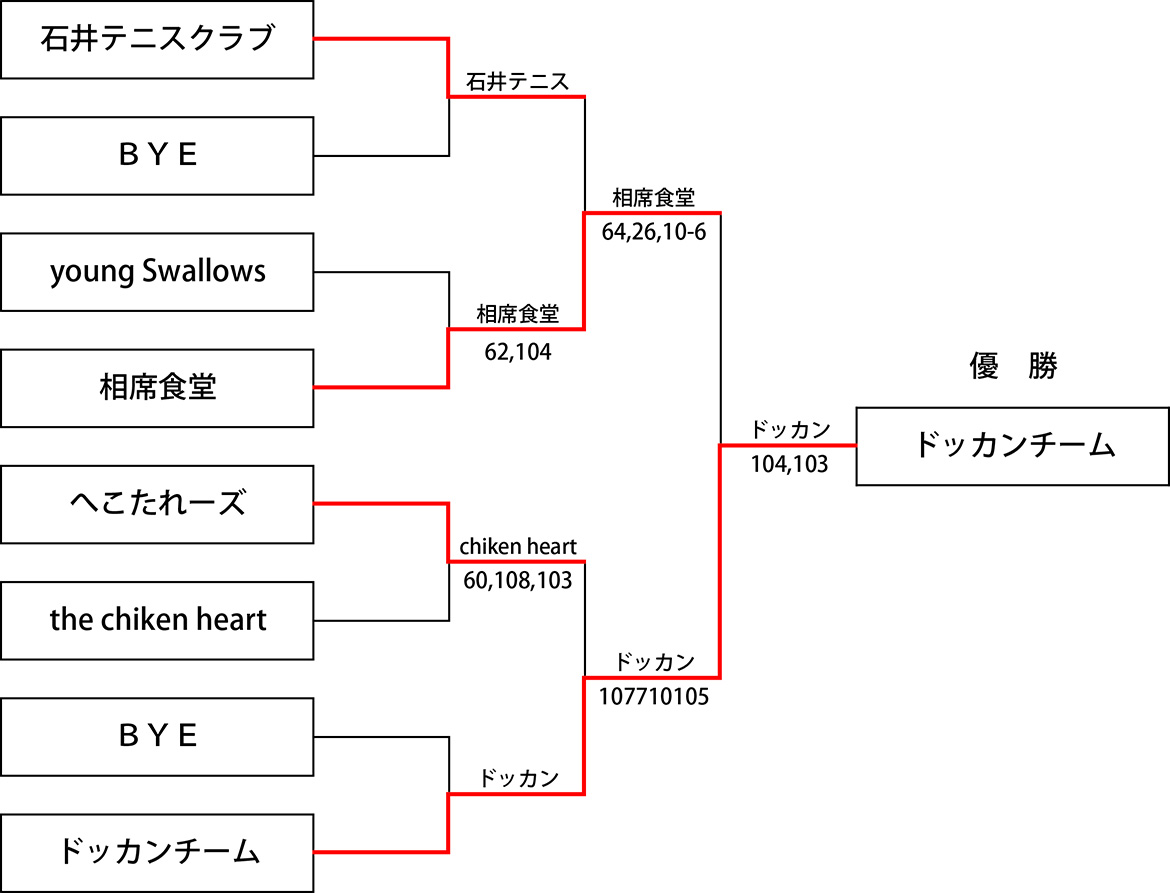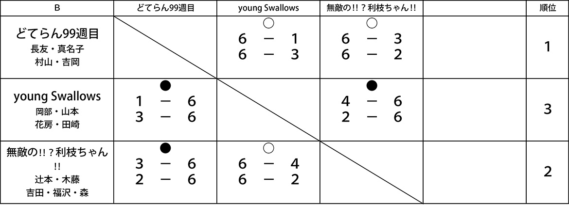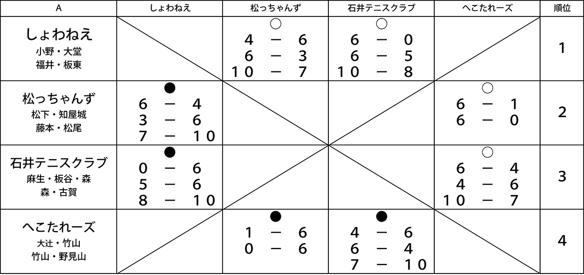 第1回 55カップ~チーム対抗戦~ 公開済み: 2026年3月22日更新: 2026年3月24日作成者: 田川庭球倶楽部カテゴリー: 大会結果 本戦Aトーナメント 優 勝どてらん99周年、松っちゃんず 本戦Bトーナメント 優 勝 ドッカンチーム準優勝 爆走ロックくん 予選リーグ 関連記事 第15回男子ダブルス~オープントーナメント~ 本戦リーグ 優 勝 世良・守田(田川テニスクラブ) 準優勝 綾戸・梅崎(テニス八人組/TEAM城島) 公開済み: 2022年4月9日更新: 2022年4月14日作成者: 田川庭球倶楽部カテゴリー: 大会結果 第57回ナイターシングルス~オープントーナメント~ 本戦Aトーナメント 優 勝 宮原可成 準優勝 守田寛啓 本戦Bトーナメント 優 勝 原明夢 準優勝 山浦委成 予選リーグ 公開済み: 2021年8月28日更新: 2021年8月30日作成者: 田川庭球倶楽部カテゴリー: 大会結果 第62回ナイターシングルス~オープントーナメント~ 本戦Aトーナメント 優 勝 竹内蓮 準優勝 永井慶人 本戦Bトーナメント 優 勝 久良知宗一郎 準優勝 山下貴輝 予選リーグ 公開済み: 2022年2月26日更新: 2022年3月1日作成者: 田川庭球倶楽部カテゴリー: 大会結果