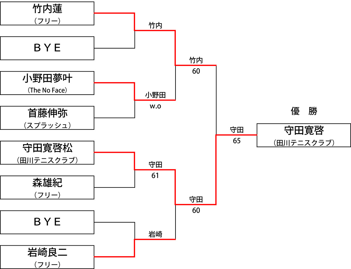 第88回男子シングルス~オープントーナメント~ 公開済み: 2026年1月31日更新: 2026年2月5日作成者: 田川庭球倶楽部カテゴリー: 大会結果 本戦Aトーナメント 優 勝 守田寛啓(田川テニスクラブ) 準優勝 竹内蓮(フリー) 三 位 岩崎良二(フリー) 本戦Bリーグ 優 勝 阿部聖矢(スプラッシュ) 準優勝 北島重男(坂村テニスアカデミー) 関連記事 第1回 ゴールデンカップ~チーム対抗戦~ 優 勝 ランチタイム (西井・上床・角田・村山) 準優勝 キャッツ (秋葉・吉田・竹ノ脇・松山) 優 勝 ドラゴンヘッド (小庄司・角田・小庄司・藤田) 準優勝 田川テニスクラブ (守田・守田・横井・花房 […] 公開済み: 2022年3月21日更新: 2022年3月29日作成者: 田川庭球倶楽部カテゴリー: 大会結果 第12回男子シングルス~CD級ーナメント~ 本戦トーナメント 優 勝 Nathan Gillin(田川テニスクラブ) 準優勝 藤岡弘行(穴生テニスクラブ) 三 位 糸山和弘(フリー) 予選リーグ 公開済み: 2024年10月12日更新: 2024年10月19日作成者: 田川庭球倶楽部カテゴリー: 大会結果 第56回ナイターシングルス~オープントーナメント~ 本戦Aトーナメント 優 勝 宮原可成 準優勝 上床昌幸 本戦Bトーナメント 優 勝 田辺佳矩 準優勝 吉永知樹 予選リーグ 公開済み: 2021年6月26日更新: 2021年6月30日作成者: 田川庭球倶楽部カテゴリー: 大会結果