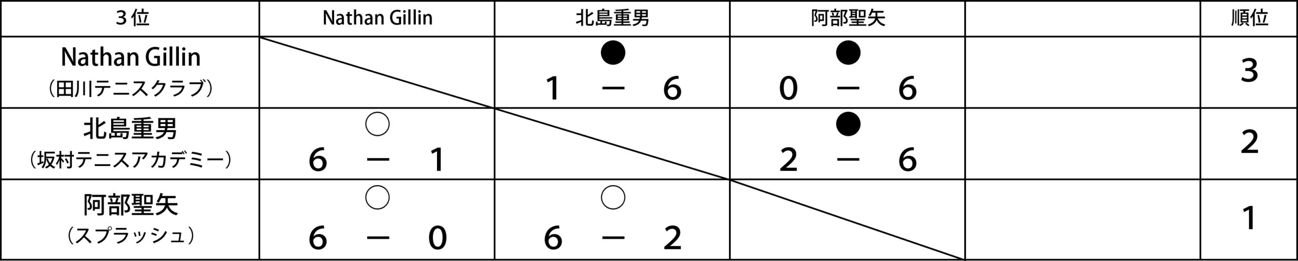 第12回男子シングルス~CD級ーナメント~ 本戦トーナメント 優 勝 Nathan Gillin(田川テニスクラブ) 準優勝 藤岡弘行(穴生テニスクラブ) 三 位 糸山和弘(フリー) 予選リーグ 公開済み: 2024年10月12日更新: 2024年10月19日作成者: 田川庭球倶楽部カテゴリー: 大会結果